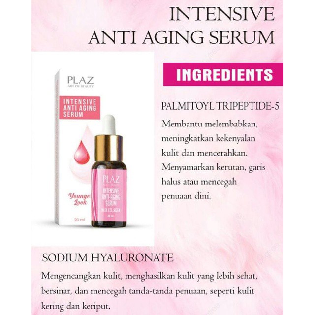 - Intense Anti Aging Serum adalah serum dengan kandungan multi antiaging seperti Palmitoyl Tripeptide-5, Hydrolyzed Rice Protein, Soybean Protein yang efektif untuk menyamarkan kerutan dan garis halus pada wajah, serta meningkatkan kekenyalan kulit. Kandungan Hyalluronate dapat menghidrasi kulit secara optimal, merawat kehalusan dan kelembutan kulit. Sedangkan Niacinamide 4% dapat mengatasi semua masalah kulit dan membantu mencerahkan kulit yang kusam.