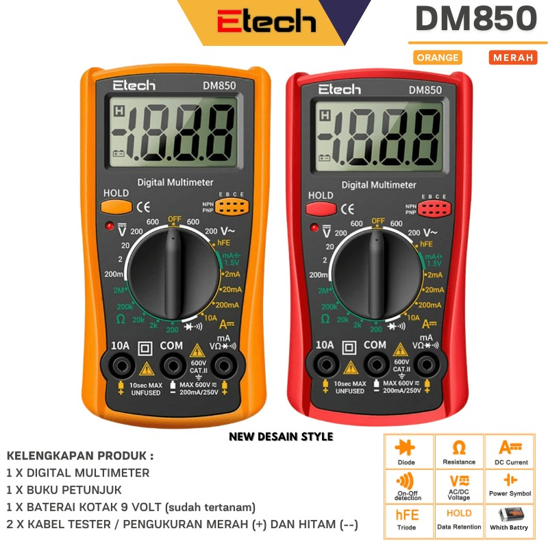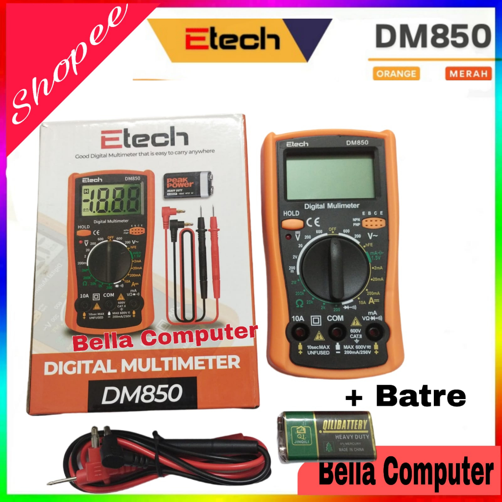 Perlengkapan Rumah > Perkakas > Electrical Tester & Multimeter > PLUS BATRE Multitester Multimeter Digital With LCD Etech DM850 / Alat Tester Tegangan Arus Listrik AC/DC .ETECH DM850 Multimeter Digital Profesional Otomatis 1999 Counts Auto AC/DC Votage Tester Ohm