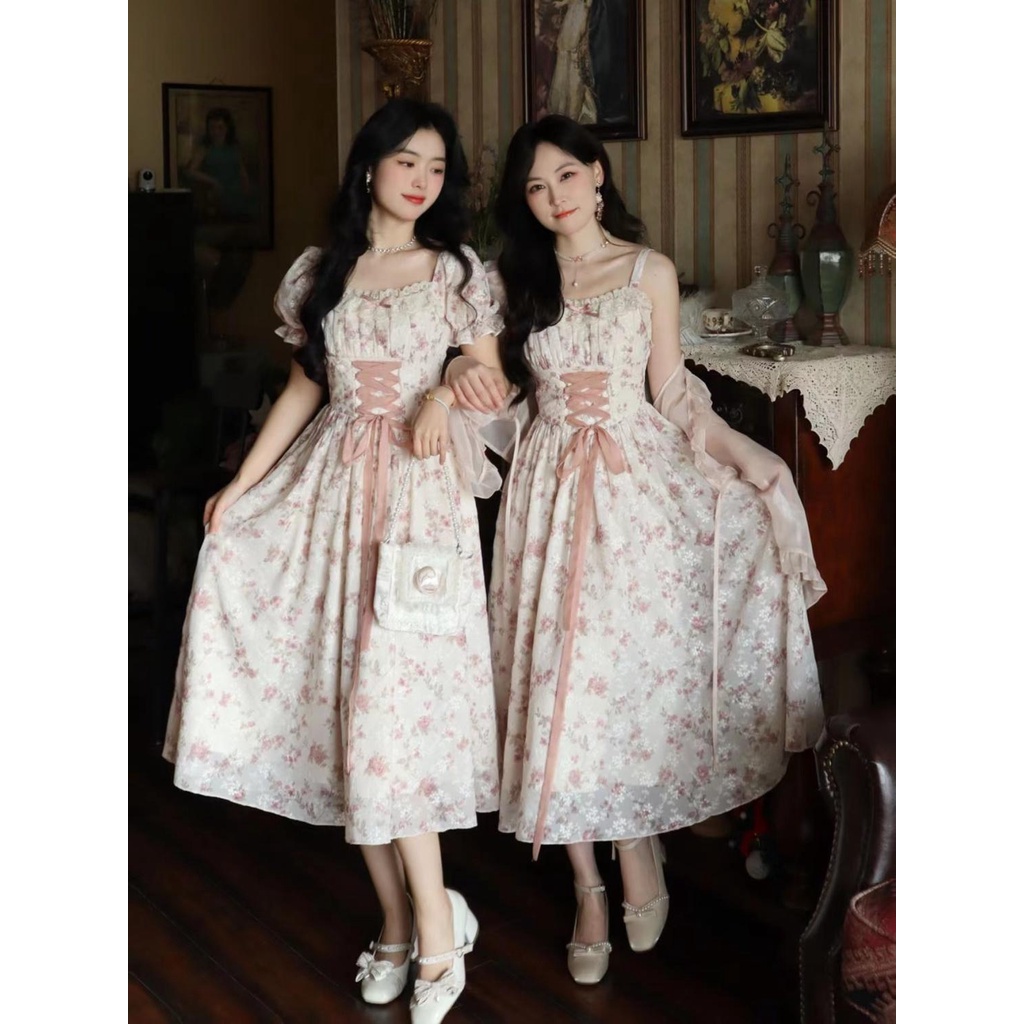 Detail Plus Ukuran GemukMMGaun Bunga Manis Perancis Gaun Kerah Persegi Wanita, Gaun Bertali Pinggang Terken