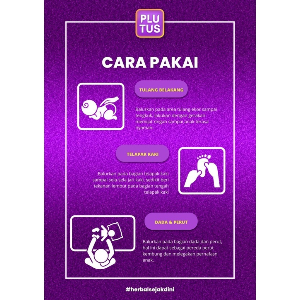 CARA PENGGUNAAN: Balurkan minyak Plutus ke punggung, perut dan telapak kaki anak