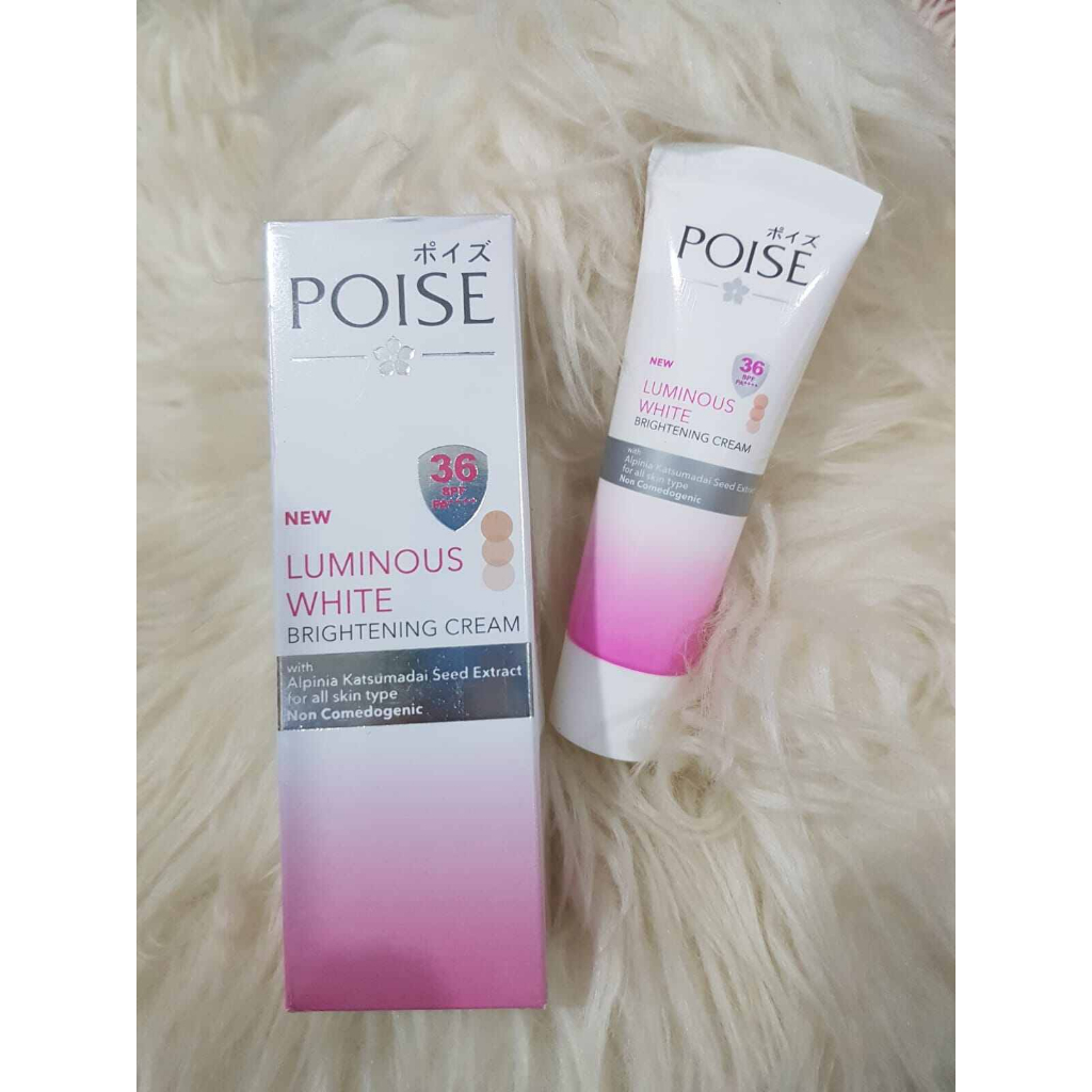Poise Luminous Whitening Cream dengan ekstrak biji Alpinia Katsumadai. -Dapat menyamarkan noda dalam 7 hari pemakaian. -Formulanya merefresh kulit dan menjadikannya lebih halus dan tetap sehat. Dengan UV Protector Advanced Brightening (UV A & UV B) dan SPF 36 pa melindungi kulit dari sinar matahari, agar kulit tetap sehat dan tampak putih merata alami.