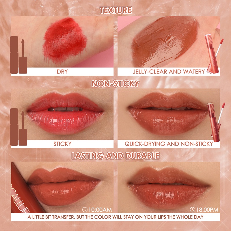 ❤️ [Tekstur bening basah] Tekstur bening basah, berair, mengandung vitamin E untuk menutrisi bibir, dapat membuat bibir Anda seketika penuh kilap, dan dengan mudah mendapatkan hasil akhir bibir yang melenting ❤️ [Lima jenis warna yang menarik] Lima jenis warna, oranye, pink, pinky rose, merah, coklat, memberikan warna-warna cerah, beberapa jenis warna memberi kamu pilihan, selalu ada warna yang cocok untuk kamu. ❤️ [Tahan lama] Untuk mengatasi masalah lip tint basah yang mudah memudar, Focallure menggunakan formula yang tahan lama, cepat kering, yang tidak lengket, tidak mudah pudar, dan memiliki riasan halus dan tahan lama. Sedikit transfer, tetapi warnanya akan tetap di bibir Anda sepanjang hari ❤️ [Pigmen Tinggi] Tekstur dewy dengan aplikator bentuk hati dua sisi yang lembut dapat mengambil lebih banyak warna, memberikan hasil warna yang kaya pada sapuan pertama. ❤️ [Tidak Lengket] Ringan, tidak lengket, tidak akan menggumpal, memiliki bibir yang cerah dan menjaga penampilan Anda tetap segar dari pagi hingga malam.