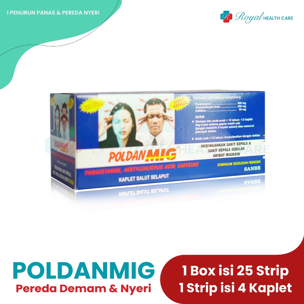 POLDAN MIG merupakan obat yang mengandung Paracetamol, Acetosal, dan Caffeine. Obat ini digunakan untuk meredakan demam, sakit kepala karena migrain, sakit gigi, sakit telinga, nyeri haid, dan nyeri ringan lainnya. Paracetamol merupakan analgetik dan antipiretik, Acetosal merupakan golongan obat Anti Inflamasi Non Steroid (AINS), dan Caffeine merupakan stimulan sistem saraf pusat untuk mencegah kantuk