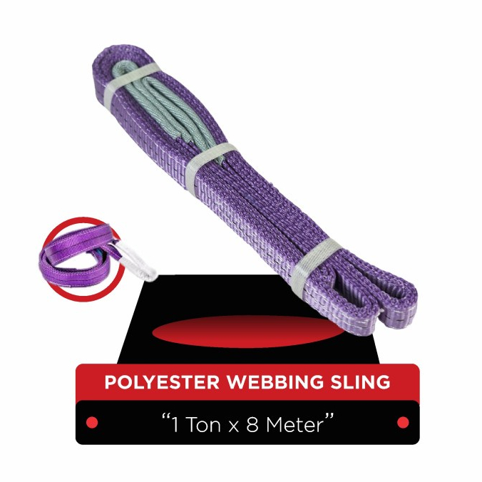 Technical Specification: - Width: 30mm - Length: 8 Meter - Working Load Limit: 1000 kg - Material: Polyester 100% - Pattern: Thickened Double Ply (Folded eye 1/2 width from 2 sides) - Safety Factor 5 : 1