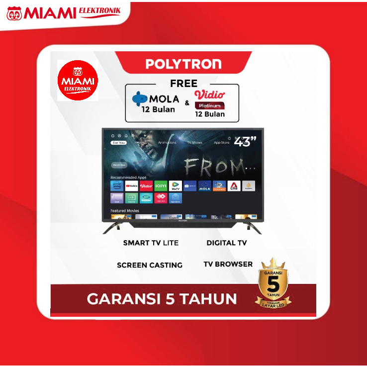 Garansi 5 Tahun (Pelopor LED TV dengan garansi 5 Tahun, termasuk PANEL LED) Digital TV (DVB-T2) : gambar lebih jernih dan tidak berbayang Tampilkan di layar TV dengan fungsi screen mirorring Free akses Mola 12 bulan dan Free akses Vidio Platinum 12 bulan Mengakes aplikasi Mola, Youtube, Prime Video, Vidio