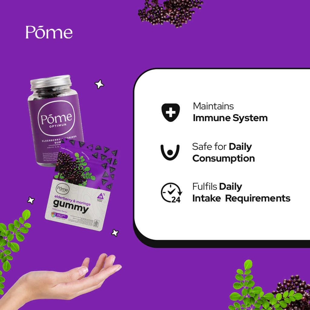Kenapa buah Elderberry dan Daun Moringa? Karena keduanya adalah kombinasi sumber antioksidan yang saling melengkapi satu sama lain! Pome Optimun menggunakan ekstrak elderberry hitam (Sambucus Nigra) dengan kadar antioksidan tinggi (10% Antosianin) yang berfungsi sebagai anti-inflamasi dan membantu memperkuat daya tahan tubuh. Sedangkan daun Moringa Oleifera mengandung banyak nutrisi yang diperlukan sistem imun tubuh seperti vitamin, asam amino dan mineral, ekstrak daun kelor Moringa Oleifera juga mempunyai khasiat sebagai antioksidan, anti-inflamasi, anti-bakteri dan mampu mengontrol kadar gula darah.