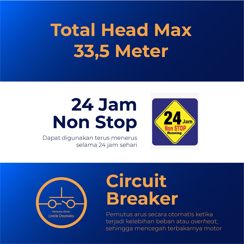 Pompa PS-103 BIT menggunakan 100% Kawat tembaga pada gulungan motornya sehingga lebih awet dan tahan lama. Pompa PS-103 BIT memilki Total Head maximal 33 meter, disaat head 10 meter debit air yang dihasilkan 17 liter per-menit, dan pada saat head 20 meter debit air yang dihasilkan 10 liter per-menit.