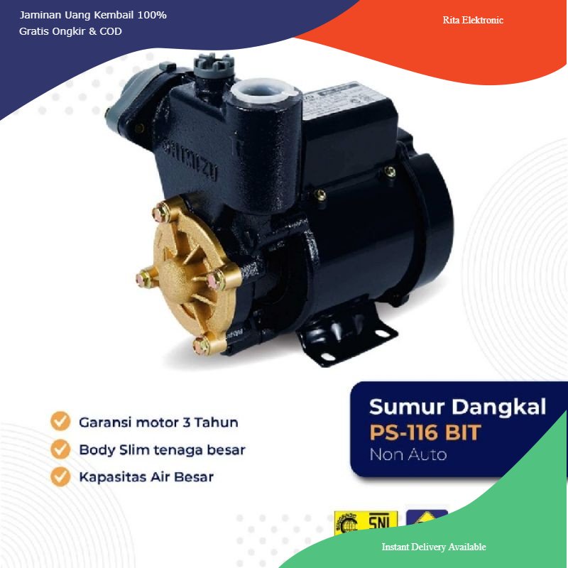 Pompa sumur dangkal 125 watt merk shimizu tipe PS 116 BIT. Pompa ini memiliki daya hisap hingga permukaan air 6 meter dan daya dorongnya hingga 21 meter. Debit air yang dihasilkan 29 liter per menit. Pompa shimizu PS 116 BIT ini dapat digunakan pada sumur, untuk mendorong air ke penampungan dan juga untuk mendorong air dari penampungan ke kran-kran air. Pompa dengan harga murah namun kualitas terjamin.