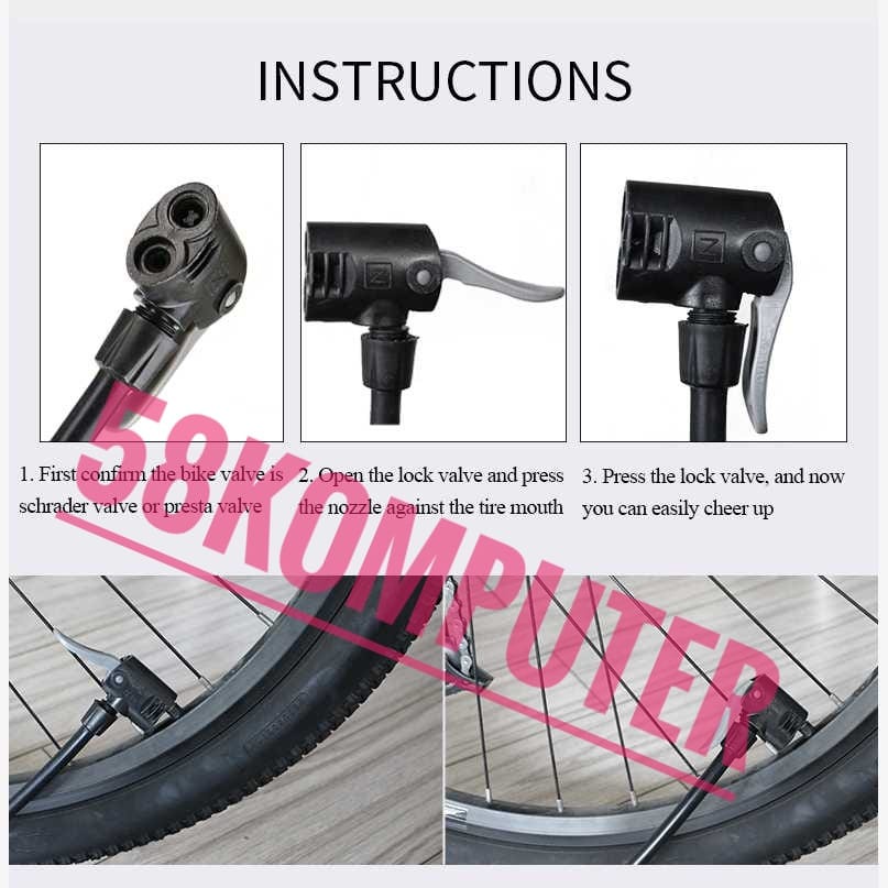Pompa Portable Dengan sistem manual membuat pompa ini dapat digunakan dimanapun dalam keadaan apapun karena tidak membutuhkan tenaga listrik atau baterai. Pompa angin ban sepeda ini memiliki bentuk yang portable sehingga tidak susah dibawa kemana-mana dan ditambah lagi dengan penjepit untuk menempatkan pompa ini dibingkai sepeda sehingga pompa dapat membawa pompa ini terus menerus di sepeda Anda. Pompa ini menggunakan sistem kokang manual sehingga dapat digunakan kapanpun dan situasi apapun tanpa membutuhkan listrik atau baterai. Dapat digunakan untuk semua jenis ban sepeda, Anda juga dapat menggunakan pompa ini untuk mengisi angin peralatan olahraga Anda, seperti bola voli, bola sepak, bola basket, dll.