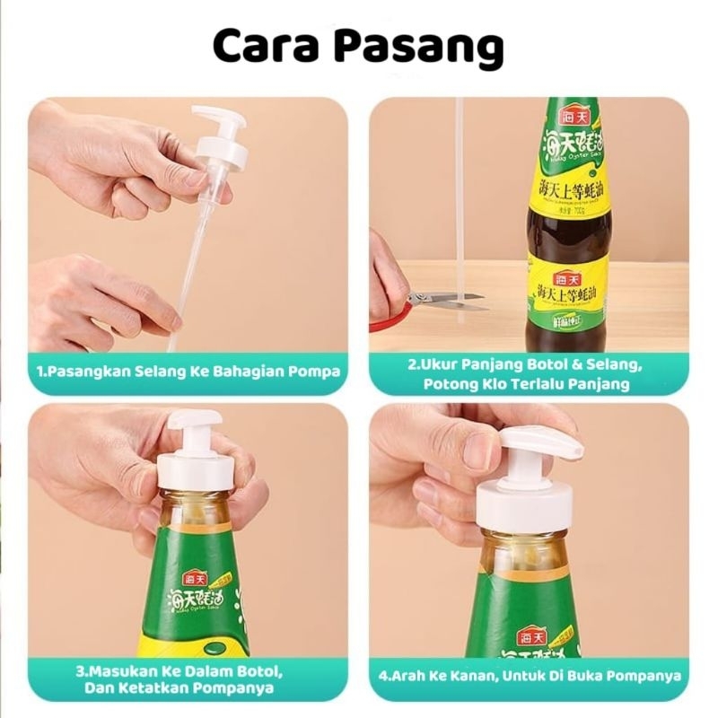 Fitur - Cocok untuk banyak jenis botol sirup/saos /cairan - Menggunakan bahan plastic food grade, lebih sehat dan mudah dibersihka- Menggunakan pompa sirup/saos/cairan lebih praktis, higienis, hemat (tidak berceceran), takaran tepat, - Desain pompa lebih panjang kedalaman botol, bisa dipotong jika terlalu panjang - Mempunyai fungsi self-locking