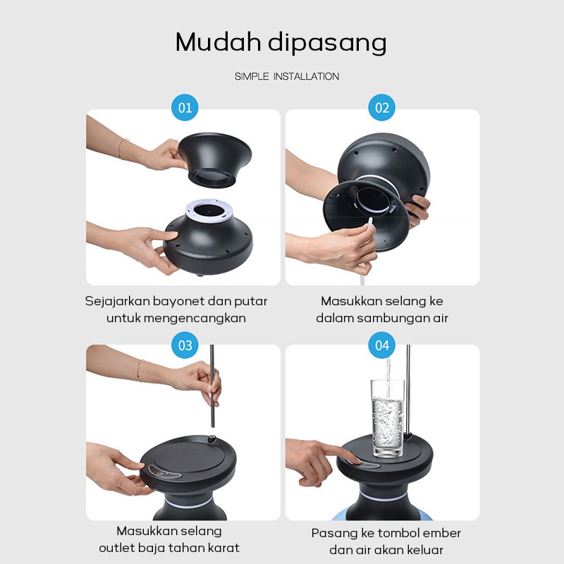 ✅ DESKRIPSI / Description: 1. Apakah kabel pengisian daya perlu dihubungkan sepanjang waktu? -NO, Tidak diperlukan. 2. Pompa Air Elektrik ini sangat mudah dan nyaman digunakan. Bisa diletakkan dimana saja, diatas gallon ataupun diatas meja sehingga pengambilan air menjadi lebih cepat dan nyaman. Desain modern dan minimalis cocok diletakkan di ruang tamu, ruang makan dll.
