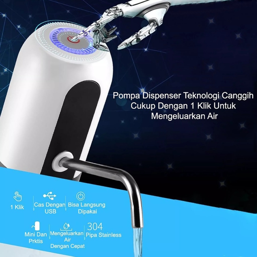 READY STOCK ! Pompa air gallon otomatis, hanya dengan pencetan jari air mengalir dari dispenser galon tanpa perlu repot menekan ataupun menuang air dari gallon anda. Minum air setiap hari sehat menyegarkan hanya sekali pencet langsung minum Desain yang modern dan futuristik enak di lihat。 Kualitas bahan dari ABS sehingga awet tidak mudah rusak dan gagang tempat keluarnya air dari stainless steel anti karat Praktis dibawa kemana saja ataupun sedang perjalanan jauh menjadi sangat mudah untuk menuang air dari gallon, mempermudah anda minum Instalasi sederhana mudah dipasang Baterai kapasitas besar lama penggunaan dan juga rechargeable bisa diisi ulang
