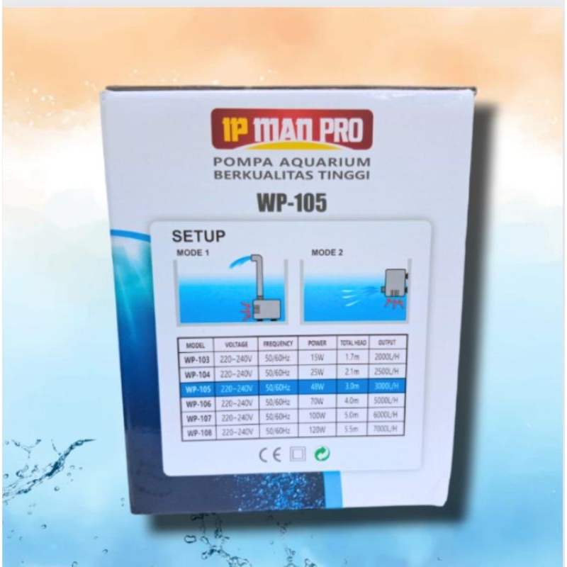 Merk : IP MAN PRO Type : WP 105 Daya : 48watt Total Head : 3.0M Output : 3000 L/H Frequency : 50/60 Hz Voltage : 220-240V