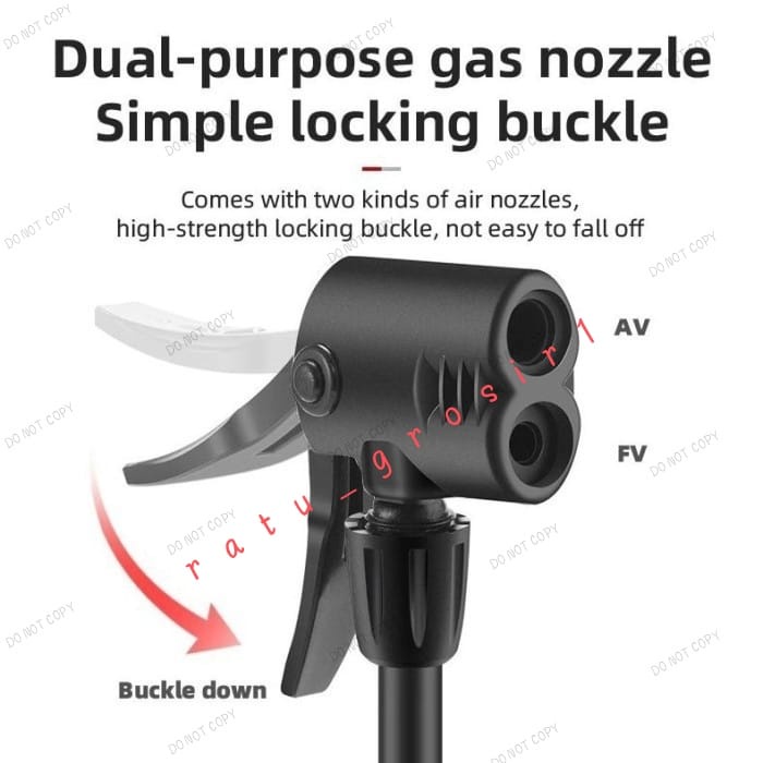 Dilengkapi dengan pentil yang dapat digunakan di sepeda motor, bola atau sepeda memompa dengan cara menggunakan kaki dan menginjak pedal yang ada. Merupakan bentuk yang kecil namun dapat menghasilkan tekanan angin yang tinggi dan dapat memberikan kenyamanan dimanapun anda memerlukan tambahan angin ban.