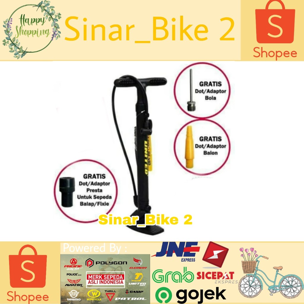 Merek : United (Original) Dimensi : Panjang +/- 60 cm Bahan : PVC, Besi Warna : - Hitam (Ready) Spesifikasi : - Pompa lantai sedang berbahan PVC, sangat kuat namun ringan - Dapat digunakan pada jenis pentil schrader dan presta dengan dipasangi adapter - Dapat digunakan untuk memompa jenis sepeda MTB, BMX, Fixie dan Balap serta dapat juga digunakan untuk memompa ban sepeda motor dan juga mobil - Memiliki dot untuk memompa bola basket, bola sepak atau bola yang lain Kelengkapan : - 1 unit pompa - 1 adapter Presta, untuk memompa pentil sepeda balap atau fixie - 1 dot/adapter untuk memompa bola sepak atau bola basket - 1 dot/adapter untuk memompa balon