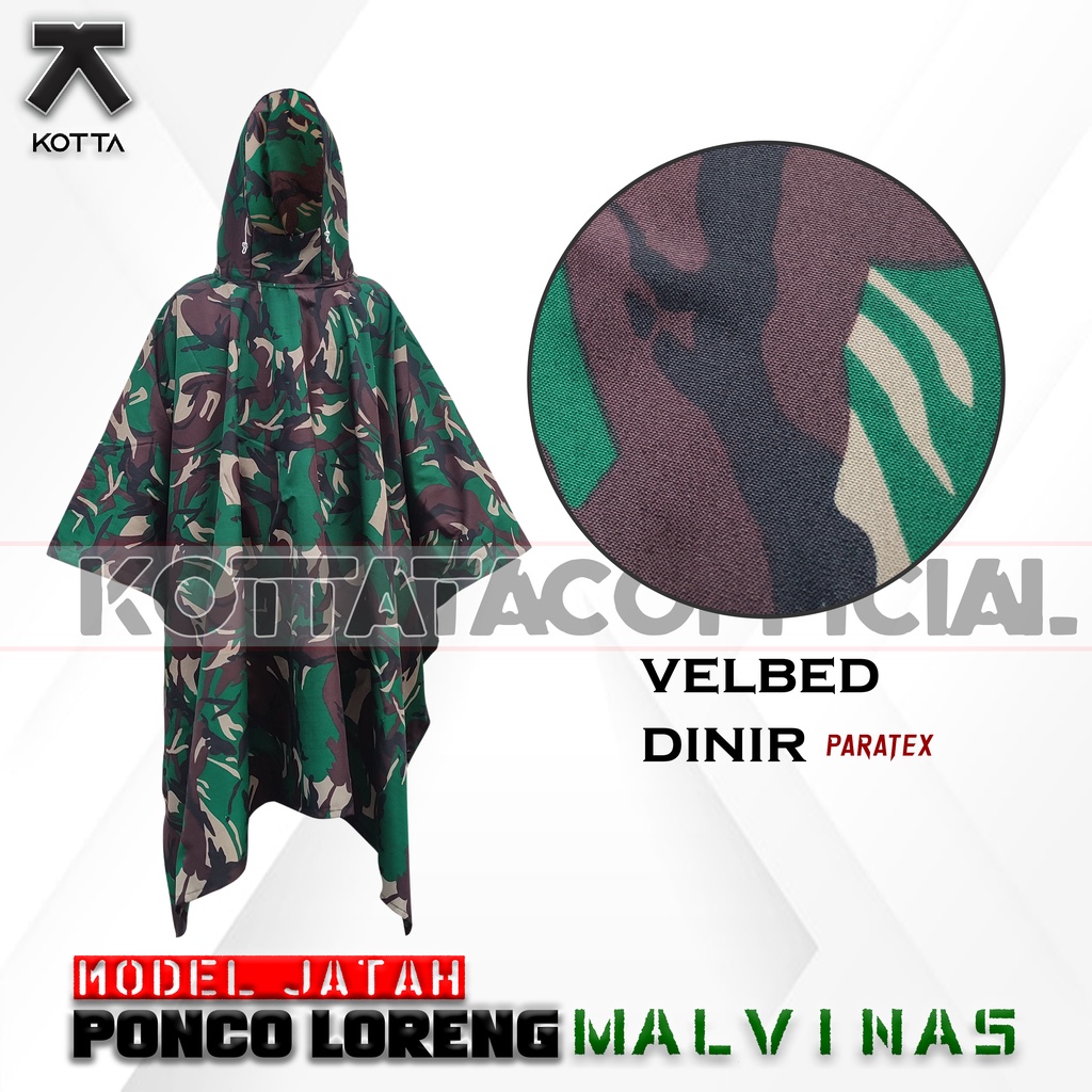 Bahan : Velbed Dinir PARATEX (water repellent) Model : Ponco/kelelawar Motif : Loreng Malvinas Kancing Snaps Jahitan rapih dan kuat Anti retak dan tahan lama