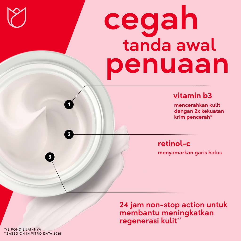 Kulitmu terlihat kusam dan noda hitam kini jadi sulit hilang? Pori-pori juga mulai terlihat besar? Atau bahkan garis halus mulai muncul? Itu tandanya kulitmu mulai berubah dan mengalami tanda penuaan. Skin lightening cream biasa tidak akan bisa mengatasinya! Waktunya beralih ke Pond's Age Miracle Night Cream , dengan 10% Retinol C & Vitamin B3 Complex, melawan tanda penuaan pada kulimu, menjadikannya cerah, lembap, dan kenyal, garis halus pun memudar sejak minggu pertama pemakaian. Dengan tekstur yang lembut, bekerja efektif di malam hari, saat kamu beristirahat. Dapatkan hasil yang lebih optimall dengan menggunakan rangkaian Pond's Age Miracle Day Cream di pagi hari.