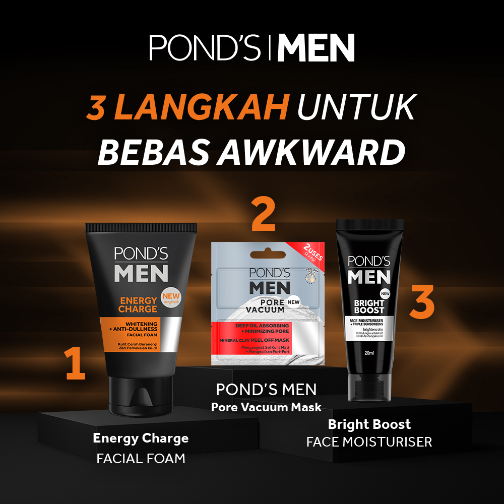 Dapatkan wajah cerah dan berenergi dengan Pond's Men Energy Charge. Mengandung Coffee Bean Extract & Cooling Menthol yang mencerahkan & menyegarkan kulit seketika. Ponds Men Energy Charge Face Wash adalah pembersih wajah khusus pria yang akan menjaga kulit sehat dan terawat. Kandungan bebas minyaknya mudah menyerap dan diformulasikan khusus untuk pria. Dengan kandungan Coffee Bean Extract dan Cooling Menthol, pembersih wajah ini akan memberikan perlindungan maksimal untuk kesegaran kulit. Anda pun dapat tampil dengan lebih percaya diri.
