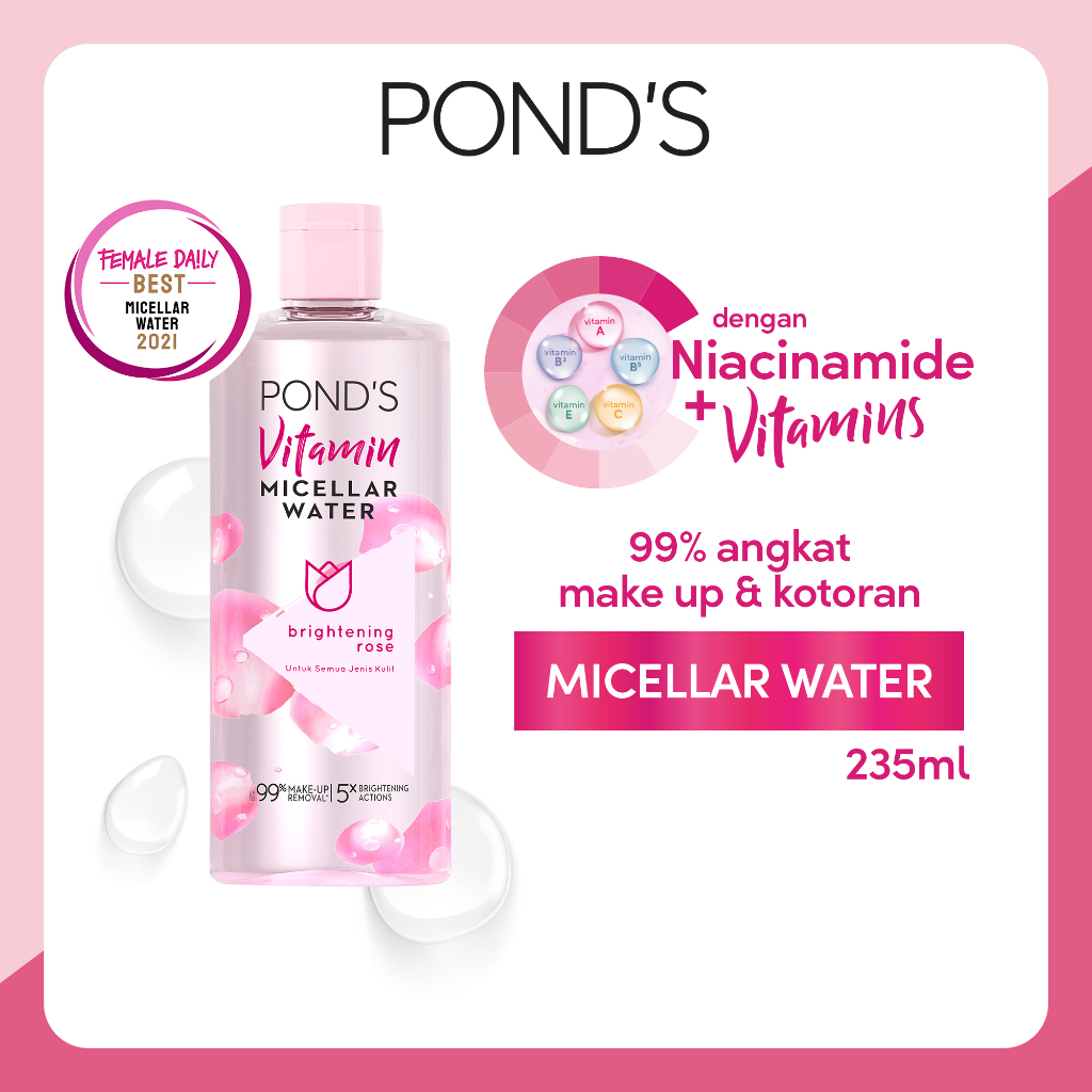 BARU! POND's Vitamin Micellar Water (Makeup Remover) Brightening Rose! Micellar water pertama yang diperkaya dengan vitamin. Makeup bersih 99%* dengan 5x brightening action** untuk hasil wajah glowing dan bersih! Diformulasikan dengan 5 vitamin (vitamin A, B3, B5, C, E) dan 100% Organic Natural French Roses untuk membersihkan makeup, kotoran, dan sunscreen hingga wajah menjadi glowing.