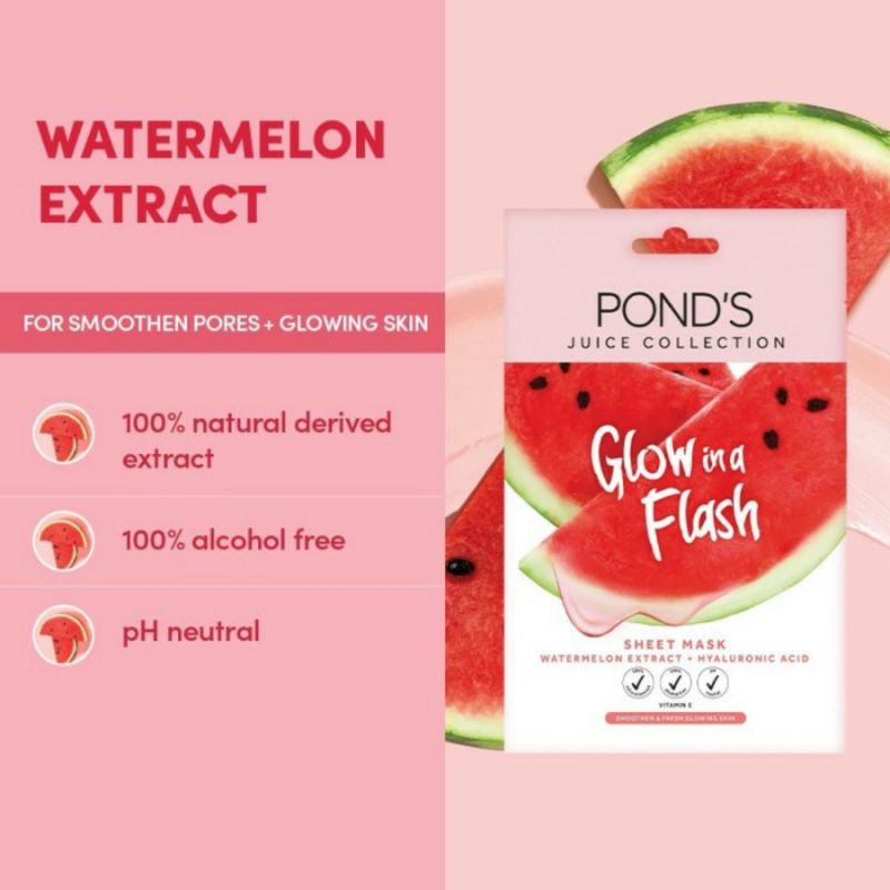 Tersedia Variant : 1.) POND'S Sheet Mask Juice Collection Watermelon Extract+ Vitamin E 20gr Sheet mask yang diperkaya dengan Watermelon Extract, Vitamin E, dan Hyaluronic Acid, kulit terasa halus, menutrisi, dan melembapkan untuk kulit terasa kenyal dan fresh glowing. Watermelon Extract, Vitamin E, dan Hyaluronic Acid, kulit terasa halus, menutrisi, dan melembapkan untuk kulit terasa kenyal dan fresh glowing. 100% natural origin extract, 100% natural fiber sheet mask, 100% alcohol free, cocok untuk semua jenis kulit! Exp Date : 04/24 (WATERMELON) *Stok exp di kirim "RANDOM" menyesuaikan keterangan
