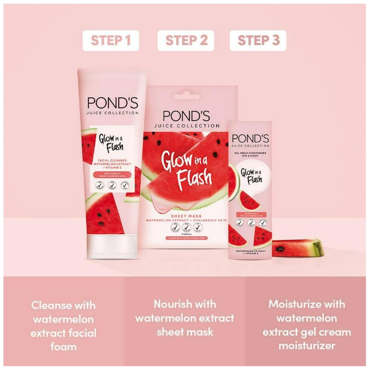 Pond's Juice Collection Watermelon Gel Moisturizer Cream Day & Night Cream wajah multifungsi yang dapat menutrisi kulit agar glowing dan dapat digunakan sebagai: - Day Cream untuk melembapkan + mempersiapkan kulit sebelum make-up - Night Cream untuk mengembalikan kelembapan saat tidur + menutrisi kulit Dapatkan kulit glowing natural dengan 100% natural origin extract, 100% natural derived moisturizing agent*, 100% alcohol free, cocok untuk semua jenis kulit! Oil-free Gel Cream Face Moisturizer, pelembab muka dengan formula ringan yang diperkaya dengan Watermelon Extract + Vitamin E.