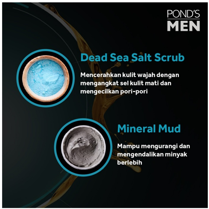 Mengandung Mineral Mud yang mampu meresap hingga ke dalam kulit** untuk mengurangi dan mengendalikan minyak berlebih. Diperkaya Dead Sea Salt Scrub yang mengangkat sel-sel kulit mati dan membersihkan pori-pori dari kotoran, komedo dan bakteri yang mencerahkan wajah seketika. Setelah pemakaian pertama, kulit tampak lebih cerah dan segar. Dengan pemakaian teratur, kulit akan tampak cerah bersinar lebih lama* sehingga Anda pun akan tampil lebih mengesankan sepanjang hari! *selama 8 jam **lapisan epidermis ^dari Pond's Men