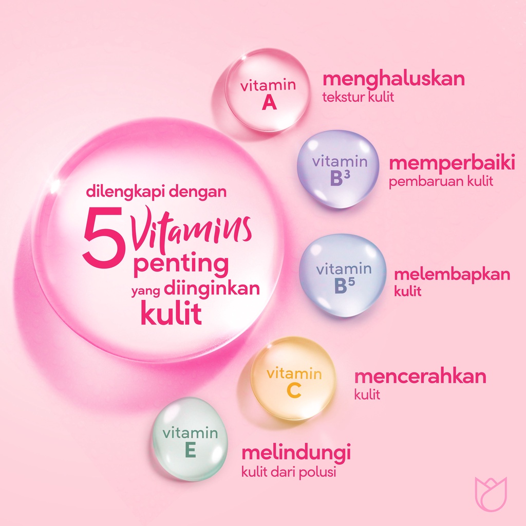 - Retinol (Vitamin A) meratakan tekstur kulit dengan cara menstimulasi produksi dan pertumbuhan sel - Niacinamide (Vitamin B3) tidak hanya membersihkan kulit, tetapi juga melindungi kulit dari kerusakan akibat polusi dan sinar matahari - Vitamin B5 mempertahankan kelembapan untuk menjaga kulit teap lembut dan halus - Vitamin C menghambat produksi melanin, memberikan kamu kulit yang lebih cerah - Vitamin E memiliki antioksidan yang melembapkan kulit dan mempertahankan kulit dari polusi