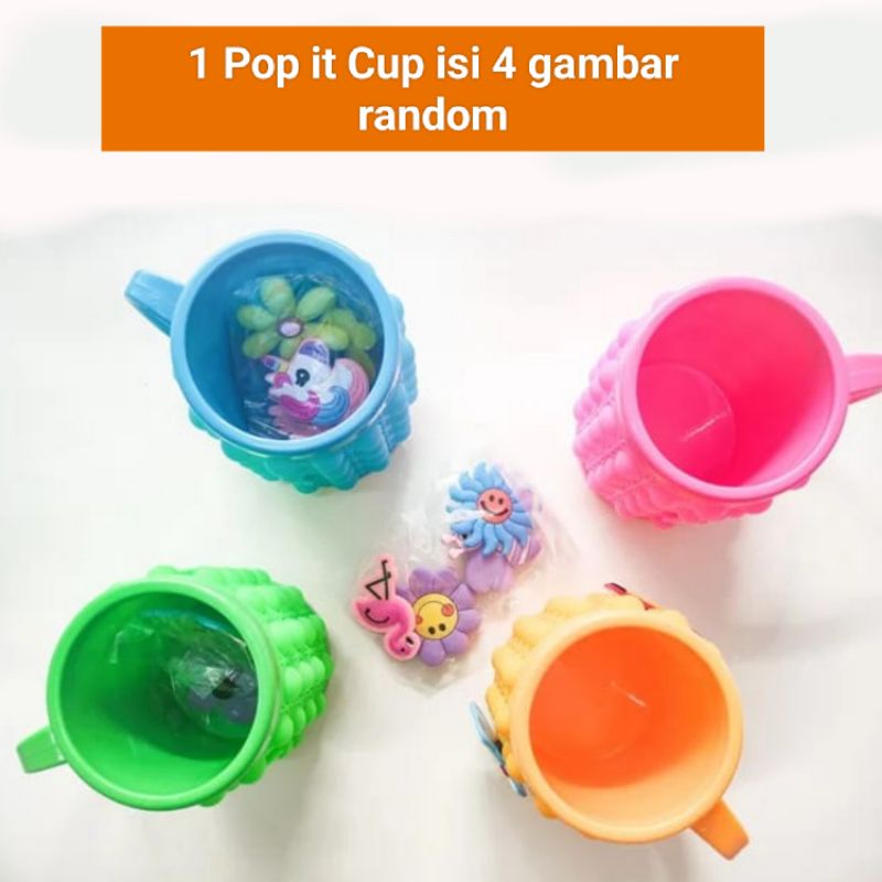Pop it Dengan Bentuk Cangkir Lucu / Pop it Cup. Tersedia Warna : *Pink *Hijau *Kuning *Biru Anda Bisa Memilih Warna di Variasi. Tiap Satu Pop it Cup dilengkapi dengan 4 gambar lucu yg bisa di ganti-ganti (4 gambar dikirim random). Terbuat dari Bahan Silikon & Plastik. Aman untuk dipakai tempat minum. Ukuran Tinggi +- 10cm.