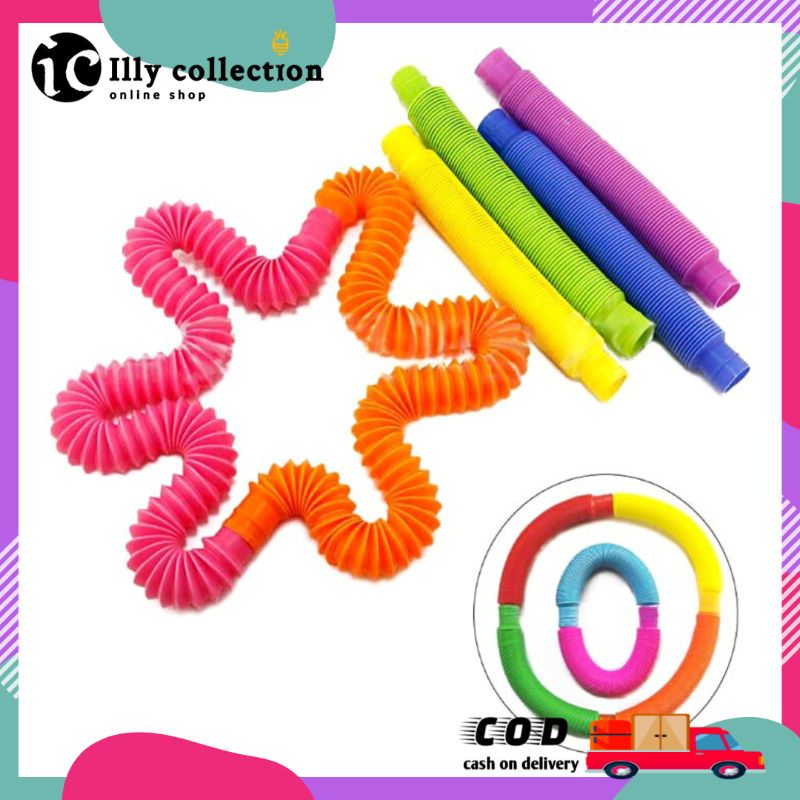 Pop tubes merupakan mainan Stick Pipa Selang terbaru dan popular dilengkapi dengan lampu LED. Cara bermain dengan menarik dan merapatkan pop tubes dan pop tubes akan menghasilkan suara yang satisfying untuk didengar.