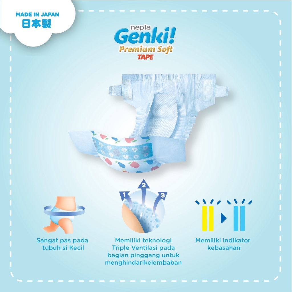 Nepia Genki Diapers Pants M32 adalah popok dari Jepang yang kini mulai beredar di pasar Indonesia. Popok ini cocok digunakan untuk bayi yang memiliki berat 7-10kg. Memiliki bahan yang halus, tidak akan menyakiti kulit bayi yang sensitif. Bahannya juga empuk dan dapat menyerap dengan baik. Penyerapan pipis yang cepat akan menjaga kulit bayi tetap kering dan terjaga dari kebocoran. Dirancang dengan bentuk seperti celana, membuat diapers ini mudah digunakan.