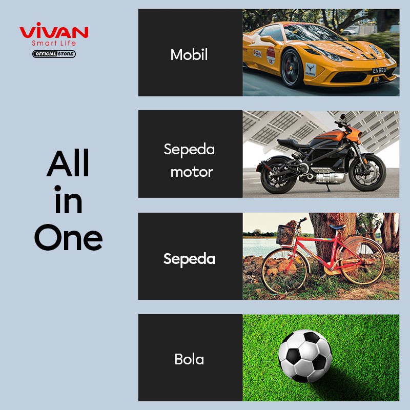 Keunggulan: -Dimensi kecil dan portable -Pengisian cepat (20 detik) -Pengoperasian pompa tidak bising -Memiliki 4 mode pompa. Mode 1 untuk mobil, Mode 2 untuk motor, Mode 3 untuk sepeda dan Mode 4 untuk memompa bola -Tekanan angin dapat dipantau dengan mudah lewat LCD display -Dibekali dengan fitur Auto-Stop. Mesin pompa akan berhenti secara otomatis ketika tekanan angin yang sudah diatur sebelumnya sudah terisi maksimal -Dilengkapi dengan senter LED sebagai alat bantu penerangan untuk keperluan darurat