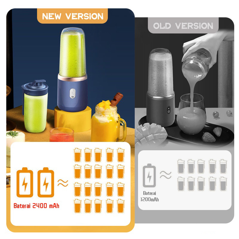 ⭐Mulai sekali klik, mudah digunakan ⭐Baterai dengan kapasitas besar,1 jam Baterai di-Charge Penuh, bisa untuk 20 x nge-Juice. ⭐Blender Tipe Cup Portabel ini sangat bagus untuk membuat Smoothie porsi 1 orang yang bergizi, Blender Jus, Mixer Buah, Sayuran, Kopi, Susu Bubuk, Protein Shake, dan Makanan Tambahan Bayi. ⭐Pisau tiga dimensi enam mata pisau, pencampuran cepat dan lebih halus ⭐Mini portabel, Kapasitas 400ML untuk memenuhi kebutuhan penggunaan sehari-hari,Dapat digunakan sebagai Cup Biasa dengan tutupnya.