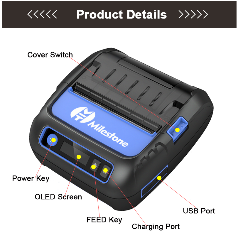 Paper width: 80mm Printing width: 72mm Printing density: 576dots/line Printing speed: 50 ~ 90 mm/s Interface: USB + Bluetooth Resolution: 203dpi Paper thickness: 0.05-0.15mm Printing command: ESC/TSPL/CPCL Font size: 12*24, 24*24 Input buffer: 256K bytes Power adapter: Input AC100-240V; output dc9v / 1a, 3.5mm round hole charging pot Lithium battery: 2600mAh/7.4v/14.8Wh Charge time: 3 hours Barcode type: UPC-A, UPC-E, JAN13(EAN13), JAN8(EAN8), CODE39, CODE 93, CODE 128, QR CODE Operating system: Android, IOS, PC (Windows) Working environment: Temp 0 C ~ 50 C; humidity 20%-85% Storage environment: Temp -20 C ~ 60 C; humidity 5%~95%