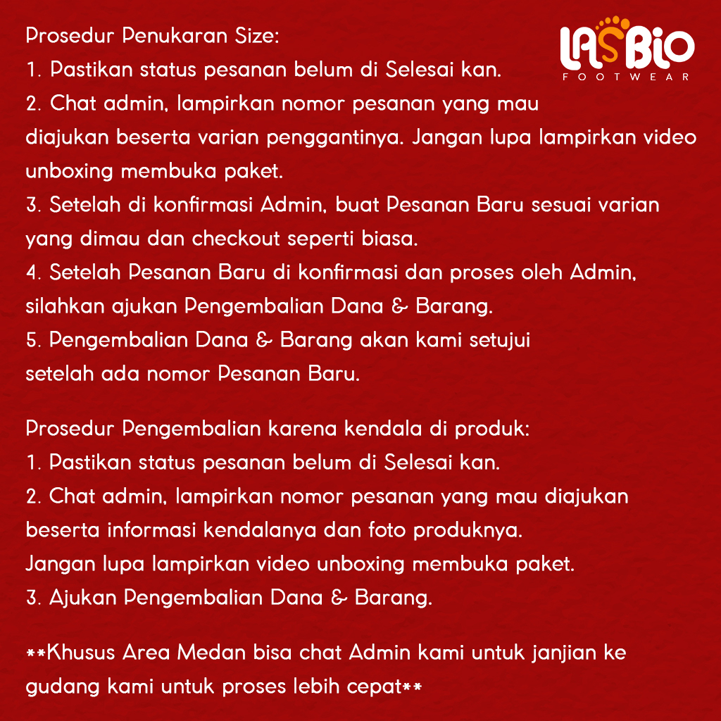 !! Untuk pembatalan/pengembalian dan penukaran barang, wajib menyertakan bukti video pada saat unboxing paket via chat ke admin !! Prosedur Penukaran Size: 1. Pastikan status pesanan belum di Selesai kan. 2. Chat admin, lampirkan nomor pesanan yang mau diajukan beserta varian penggantinya. Jangan lupa lampirkan video unboxing membuka paket. 3. Setelah di konfirmasi Admin, silahkan buat Pesanan Baru sesuai varian yang dimau. Checkout pesanan tersebut seperti biasa. 4. Setelah Pesanan Baru di konfirmasi dan proses oleh Admin, silahkan ajukan Pengembalian Dana & Barang. 5. Pengembalian Dana & Barang akan kami setujui setelah ada Pesanan Baru.