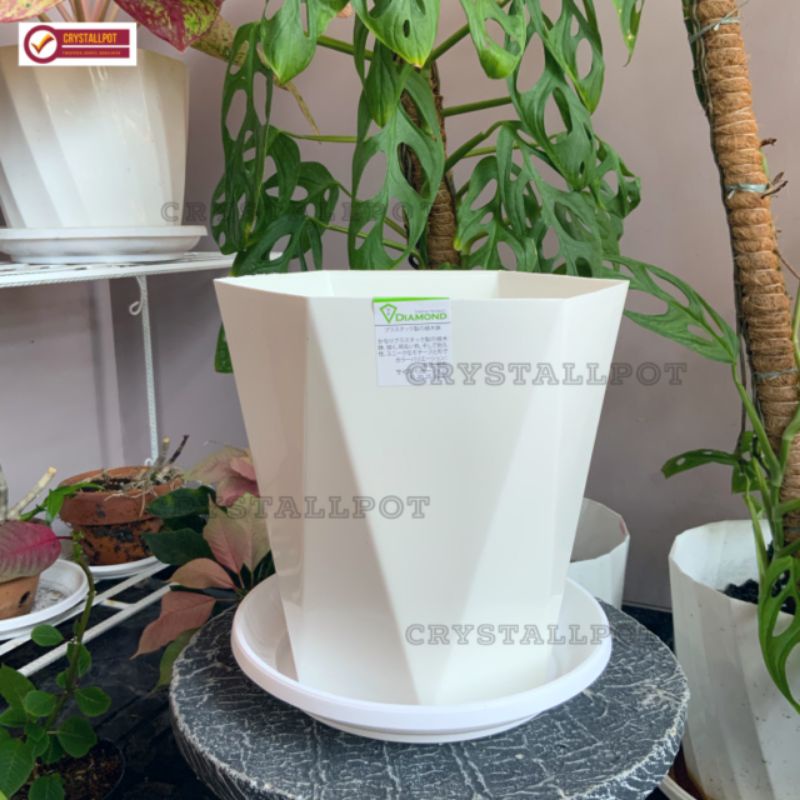 Detail POT BUNGA TANAMAN TINGGI TABITHA DIAMOND 30 PUTIH + TATAKAN PUTIH