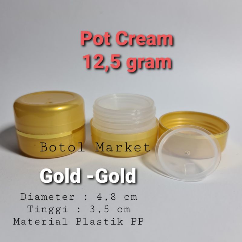 Pot Cream 12,5 gram (tergantung kepadatan isi) Berbahan plastik PP Diameter : 4,8 cm Tinggi : 3,5 cm berat 30 gram/pc (1kg Bisa Untuk 33pcs)