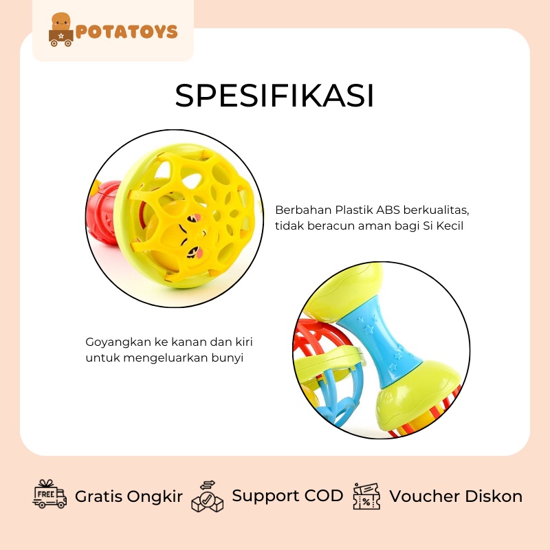 - Baby Rattle : Mainan Rattle biasanya memiliki bentuk yang mudah digenggam dan bersuara saat digoyangkan, sehingga mampu membantu Si Kecil merangsang perkembangan kemampuan motorik halus, intelektual, penglihatan, pengenalan tekstur, dan koordinasi. Membantu si kecil merangsang pertumbuhan gigi dan melatih si kecil untuk menggenggam benda.