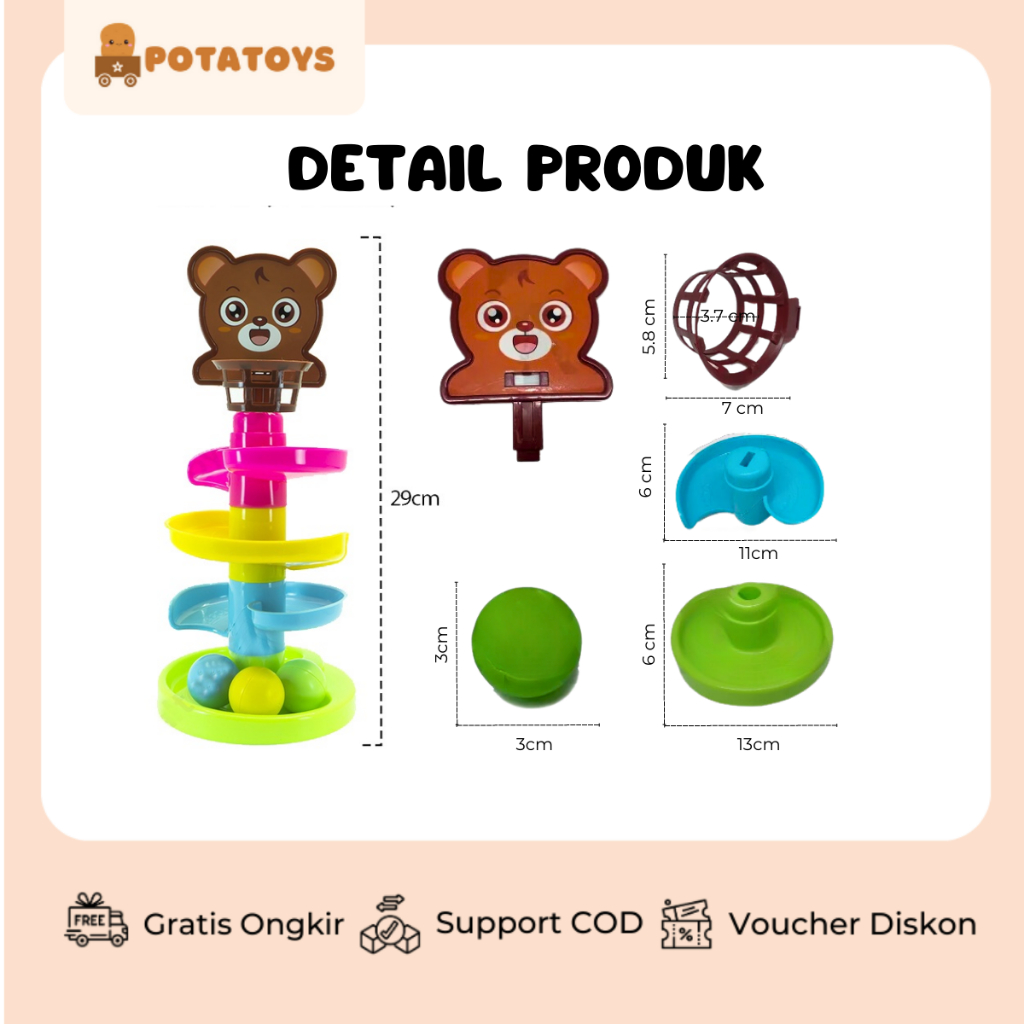 Rolling Ball mainan anak-anak seluncuran bola atau bola yang berputar dari atas ke bawah. Salah satu mainan edukatif untuk anak. Dapat membantu kefokusan anak terhadap sesuatu. Cocok untuk anak laki-laki maupun perempuan usia diatas 2 tahun. Cocol untuk hadiah dan kado.