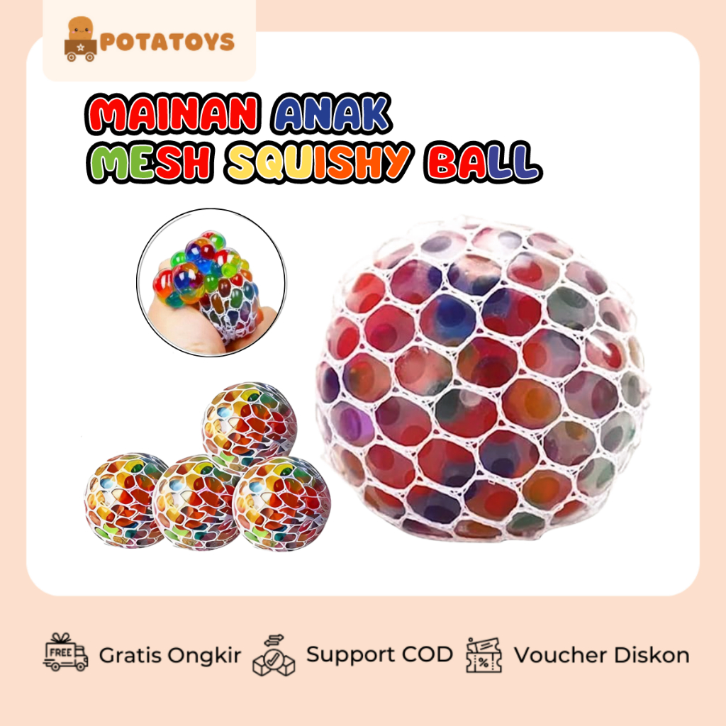 Detail : Nama produk: Mesh Squishy Ball Bahan Produk: TPR Warna produk: warna-warni Ukuran produk: 2.5 inci / +- 5cm Usia: >3 tahun Kemasan: Jaring+Plastik
