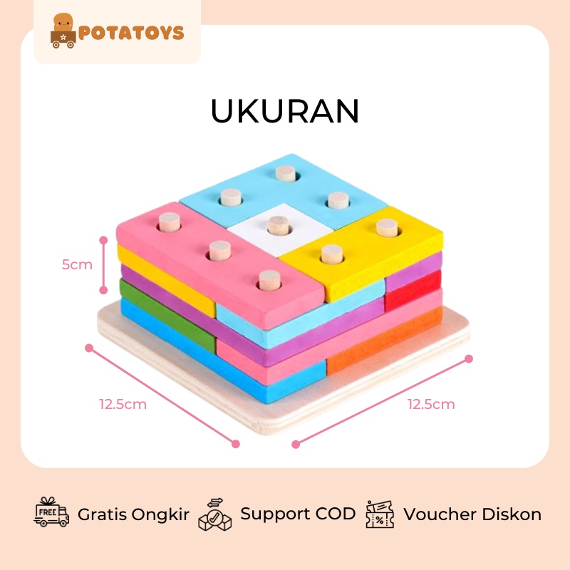 manfaat : - meningkatkan kemampuan motorik halus anak - meningkatkan daya berpikir anak dalam mencocokan bentuk - membantu anak mengidentifikasi bentuk dan melatih kesabaran