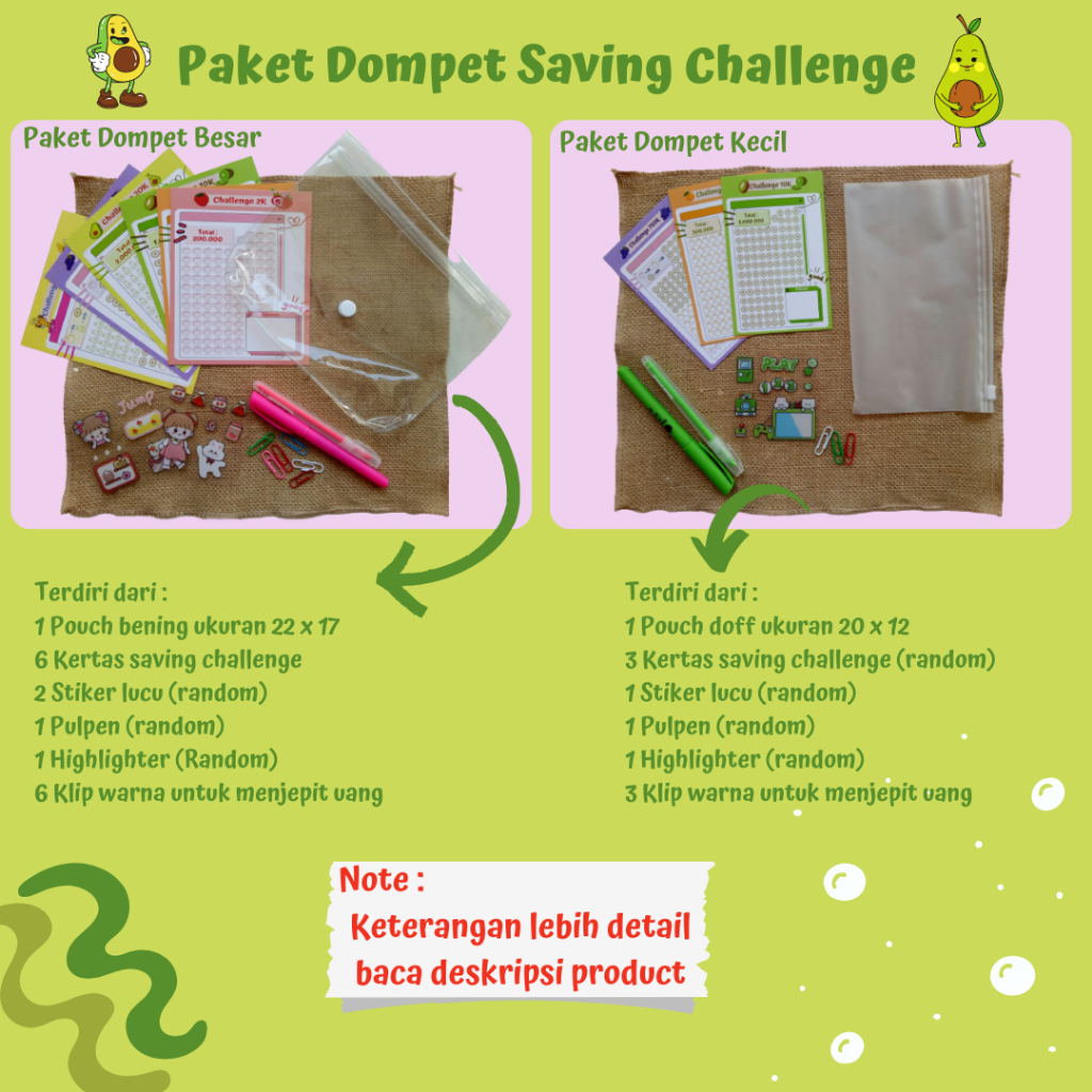 Paket terdiri dari 2 macam paket, yaitu : 1. Paket Pouch Besar, terdiri dari 1 Pouch bening besar ukuran 22 x 17, ada kancing dibagian depan & resleting dibagian dalam 6 Kertas saving challenge yg berbeda2 & full colour, bahan blueswhite (tebal), ukuran 12,5 x 15,5 cm 2 Stiker lucu 1 Pulpen 1 Highlighter 6 Klip warna untuk menjepit uang