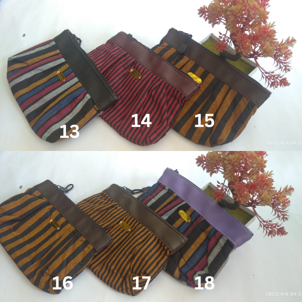 Pouch bahan tenun lurik asli kombinasi kulit sintetis. Bukaan resleting. Ukuran 24 cm x 15 cm. Cocok buat tempat komestik, menyimpan uang receh/koin, bisa juga buat cluth/tas tangan di acara kondangan.