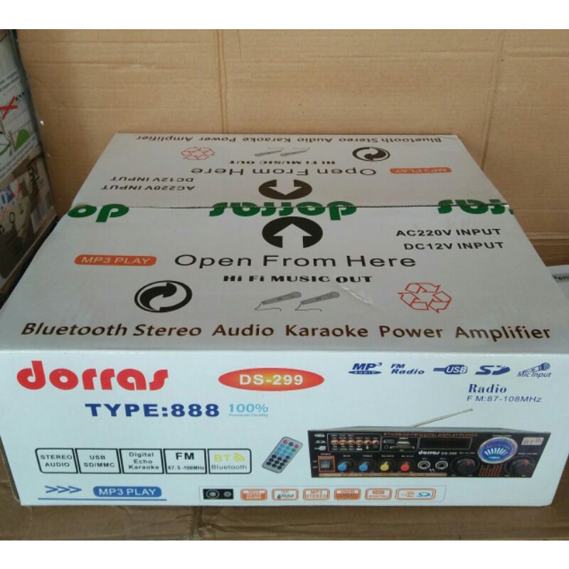 Power amplifier Dorras DS-299 - Amplifier bisa Ac dan DcPOWER AMPLIFIER KARAOKE STEREO AUDIO / POWER AMPLIFIER WIRELESS / AMPLIFIER BLUETOOTH KARAOKEFitur: ● Antarmuka: port AUX, BT, MP3, FM. ● Kontrol volume treble dan bass independen, memungkinkan Anda memainkan dunia musik dan memberi Anda efek suara HIFI yang nyata. ● Sistem amplifier yang ringkas dan kuat, mudah dibawa dan digunakan. ● Bluetooth bawaan untuk streaming audio nirkabel. ● Kompatibel dengan semua perangkat bluetooth favorit Anda (Untuk iPhone, Android, Smartphone, iPad, Tablet, PC, dll.) ● kartu memori SD & Pembaca Drive Flash USB. ● Panel Layar LED Digital. ● Jack Konektor Input Dua mic. ● Fungsi audio dan pemutaran FM.