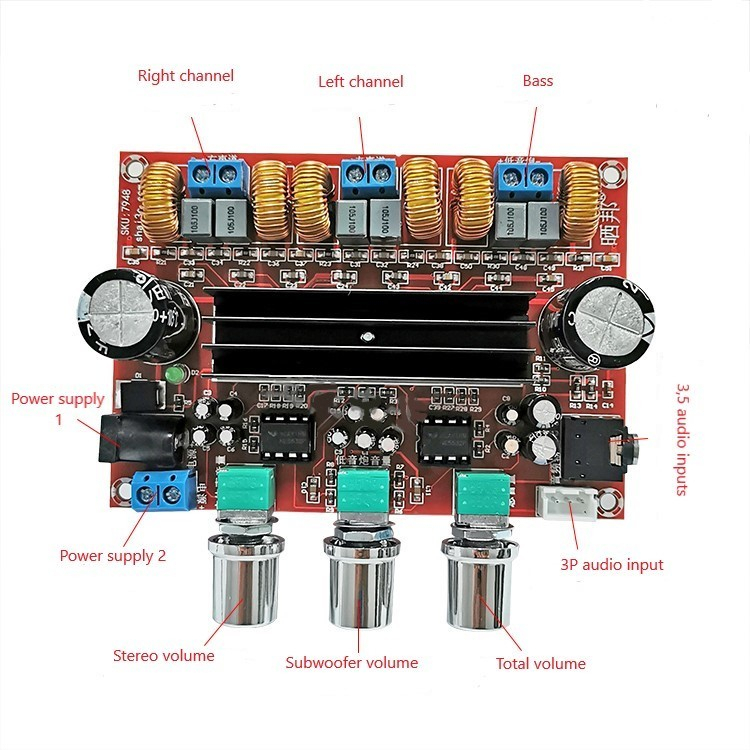 Power supply voltage: DC12-24V Output power: 50w*2+100w subwoofer*1 Output load: 4-8Ω Frequency range: 14-100KHZ Number of channels: 3 (left channel + right channel + subwoofer) Switching frequency: 1.2MHz