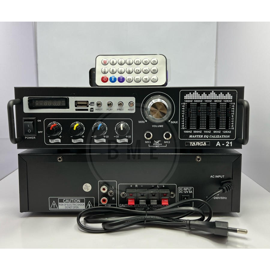 Spesifikasi power amplifier TARGA A-21 bluetooth usb SD card mp3 player digital player hi-fi stereo listrik AC dan DC power 2x200watt frekuensi 40Hz - 20KHz