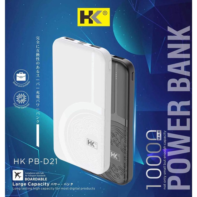 Power bank HK D21 10.000mah Input micro : 5V=2.1A Input tipe C : 5V=2.1A 2 output USB LED INDICATOR