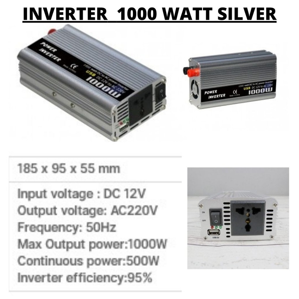 2. Inverter 1000 Watt Warna Silver : Dimension : 185 x 95 x 55 mm, Others Input voltage : DC 12V, Output voltage: AC220V, PSW, Frequency: 50Hz Max Output power:1000W, Continuous power:500W, Inverter efficiency:95% Berat : 1 kg