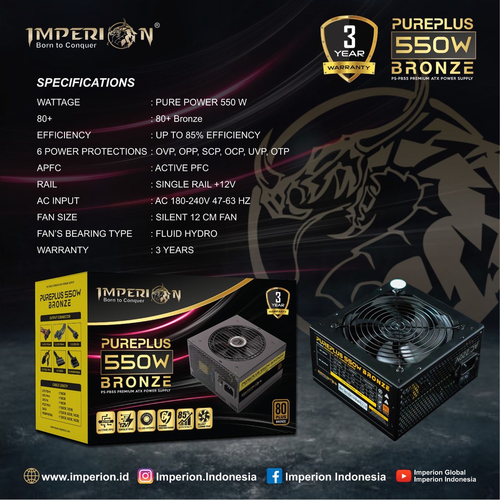 Komputer & Aksesoris > Komponen Desktop & Laptop > Power Supply > Power supply gaming imperion atx 550w 80 plus bronze 120mm fan pureplus Ps-pb55 - Psu pc cpu 550 watt 80+