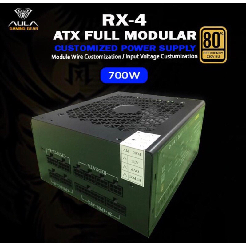 FULL MODULAR CABLE Brand : AULA Product Name : RX-4 700W Support Processor : INTEL & AMD Rate Power : 700W Output Voltage : 12V Input Voltage : 220-230V AC