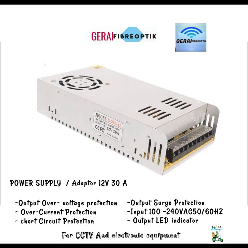 Cocok di pakai untuk aplikasi CCTV, Radio, Charger, LED Strip, Computer project. - Ada cooling fan. - High Efficiency, Low Temperature. - Safety design with shortage protection, overload protection and auto voltage switching. - DC Voltage: 12V. (adj - 13,8v ) - Current Range: 0-30A - Rated Power: 360W - Dimensi : +- 12 X 22 x 5 CM